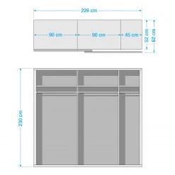 - Hauteur 230 cm : 2 tablettes et 1 tringle à vêtements par élément d’armoire